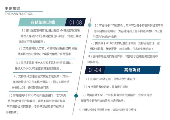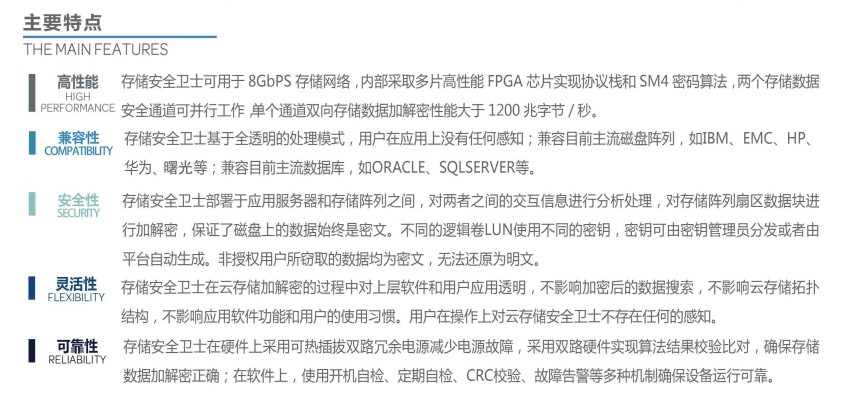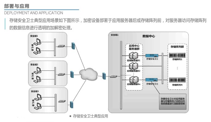 存储安全卫士属于存储加密设备,该设备采用物理门卫式方式,部署在应用服务器与存储阵列之间的光纤通道上,不改变原有存储网络拓扑和数据业务的使用模式,对应用服务器访问存储阵列的数据信息进行透明的加解密处理和访问控制,为存储网络提供密码保障服务。